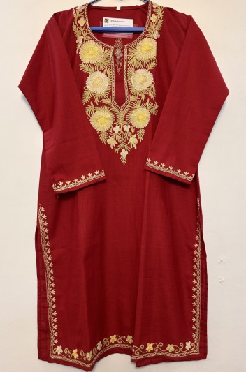 Redefine your style with our sophisticated Kashmiri Aari Embroidered Black Cotton Kurta. This captivating kurta is a masterpiece of traditional Kashmiri Aari work, boasting vibrant and bold floral and leaf motifs that stand out beautifully against the classic black cotton fabric. Designed for comfort and elegance, it's made from premium, breathable cotton, ensuring a delightful feel all day long. The intricate embroidery adorning the neckline, cuffs, and hem adds a touch of artisanal charm, making it a perfect choice for those who appreciate unique ethnic fashion. Elevate your everyday look or dress it up for an evening out.