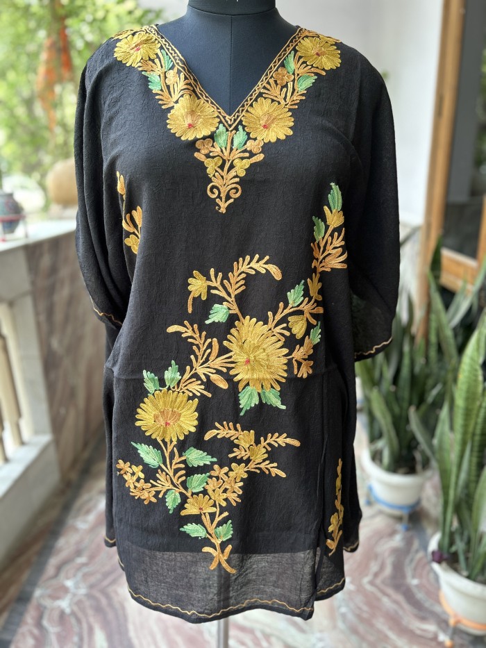 Black Kaftan with Yellow & Green Floral Embroidery | Elegant Summer Style