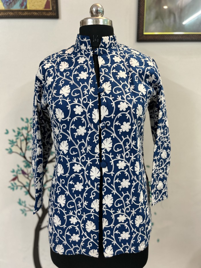 Deep Blue Wool Short Jacket with White Aari Vine Work