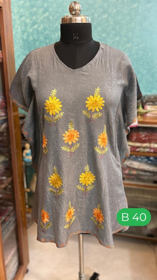 A modern short-length grey kaftan with striking yellow-orange flower embroidery. Great for casual wear, lounging, or pairing with jeans or leggings.