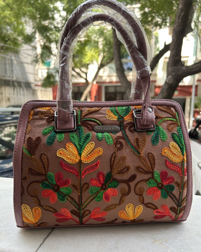 A charming satchel handbag that perfectly blends traditional craftsmanship with a contemporary silhouette. The main body features intricate, vibrant floral embroidery set against a warm, earthy background (like a dark taupe or light brown). The entire bag is framed with an elegant mauve/dusty rose faux leather piping and matching handles, creating a sophisticated color contrast. Its structured design ensures it holds its shape, making it ideal for carrying daily essentials in style. Perfect for adding a pop of color and texture to your outfit.