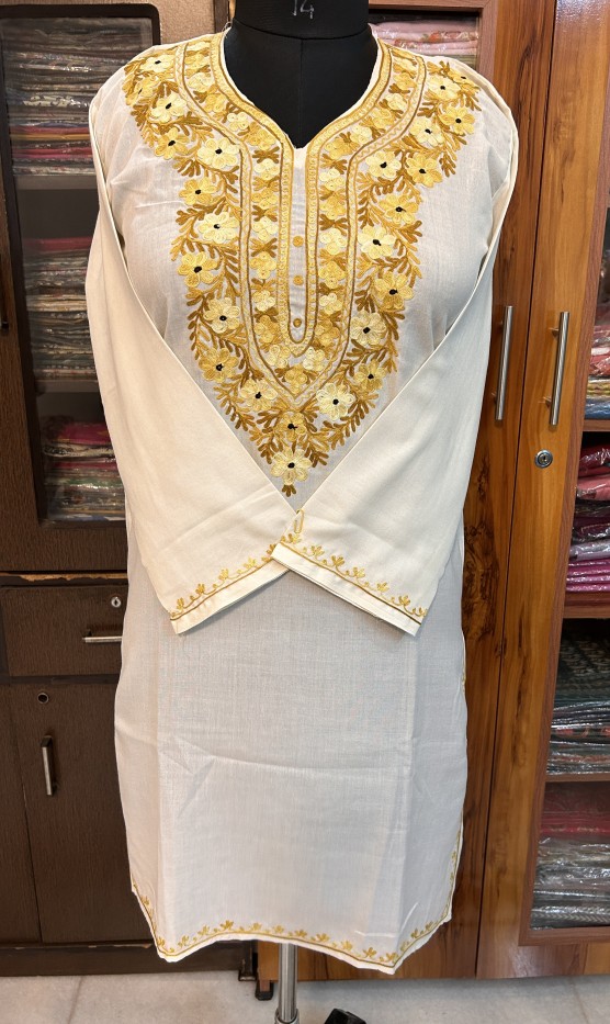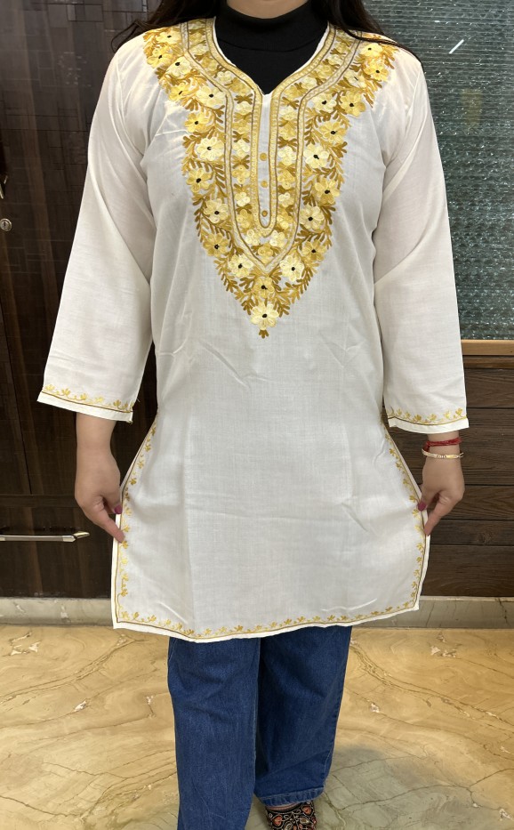 Discover the subtle elegance of our Artisan Crafted Kashmiri Aari Cotton Kurti. This beautiful piece, made from 100% pure, breathable cotton, offers supreme comfort with a touch of refined style. The pristine beige base serves as a perfect canvas for the stunning Kashmiri Aari embroidery, featuring a vibrant array of floral and vine motifs in shades of red, orange, and pink. The intricate handwork graces the neckline, extends down the front, and adds delicate touches to the cuffs and hem, reflecting the rich artistic heritage of Kashmir. Ideal for both daily wear and special occasions, this versatile kurti pairs wonderfully with a variety of bottoms, from white palazzo pants to jeans, creating a look that is both graceful and unique. Elevate your wardrobe with this timeless piece of Indian craftsmanship.