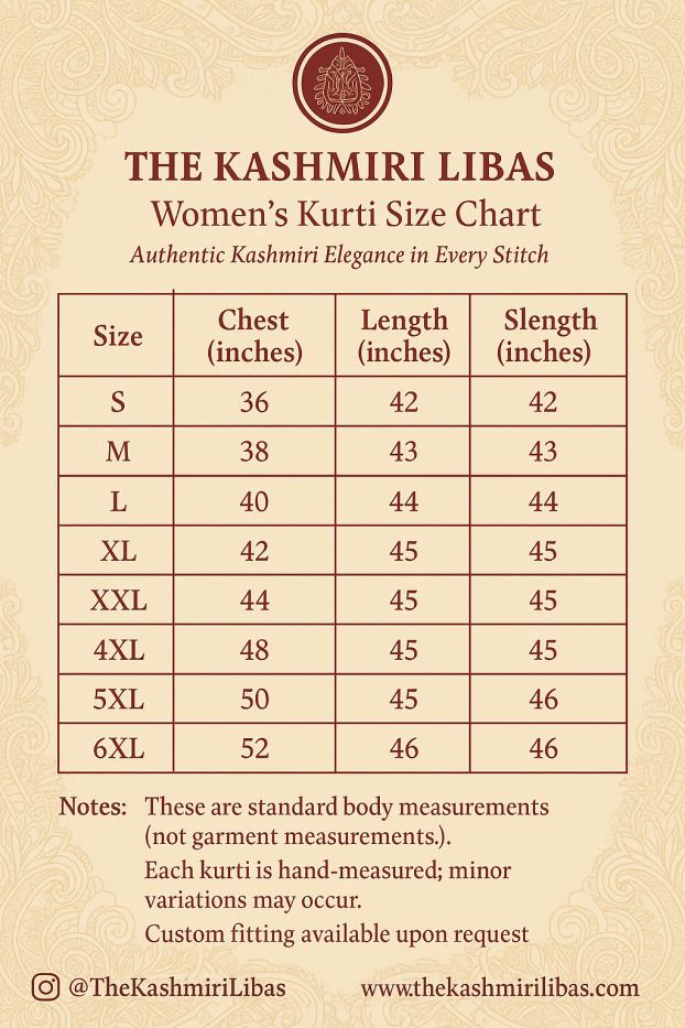 This beautiful Kashmiri Aari embroidered kurti in a soft beige tone brings together elegance and tradition. Hand-embroidered by skilled artisans of Kashmir using the famed Aari technique, it features detailed floral patterns in vibrant pink and maroon threads. The full-sleeve design with contrasting embroidered borders on the neckline, sleeves, and hem gives it a rich and graceful appearance. Crafted in breathable cotton, it's ideal for festive occasions, office wear, or cultural gatherings. Pair it with leggings, palazzos, or pants for a sophisticated ethnic look.