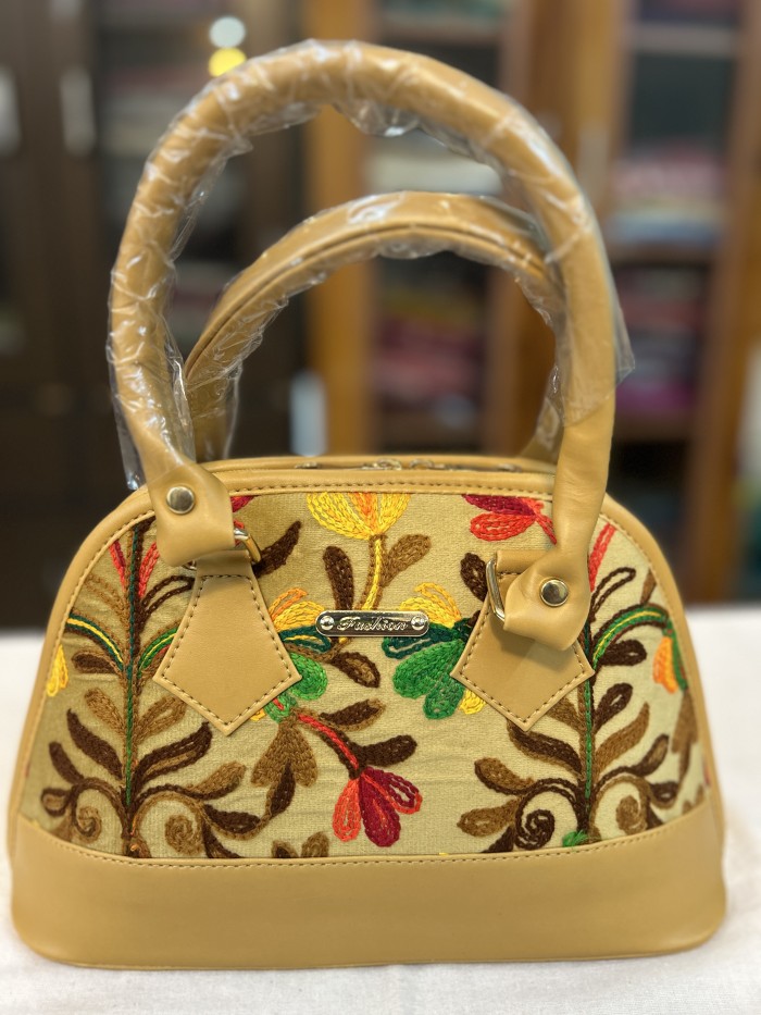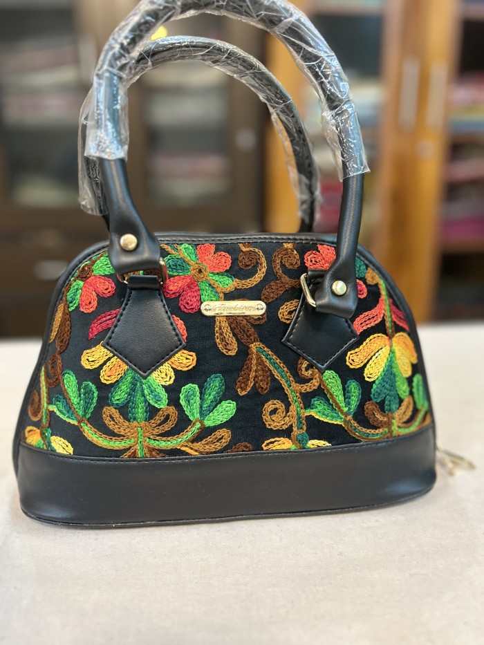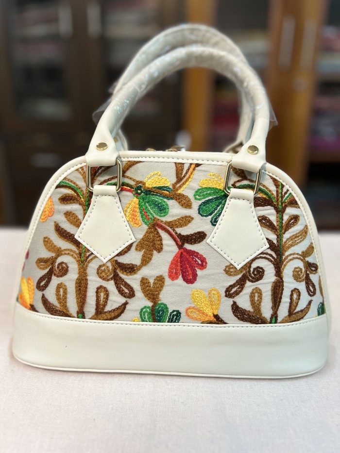 Add a touch of artistic flair to your collection with the Kashmiri Embroidery Mini Dome Satchel. This compact handbag features a timeless silhouette elevated by intricate, vibrant floral threadwork on the central panels. The high-quality faux leather trim, handles, and base perfectly frame the embroidery, creating a striking contrast and polished look.
