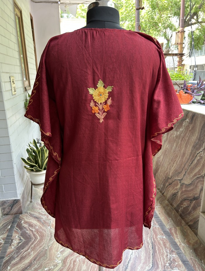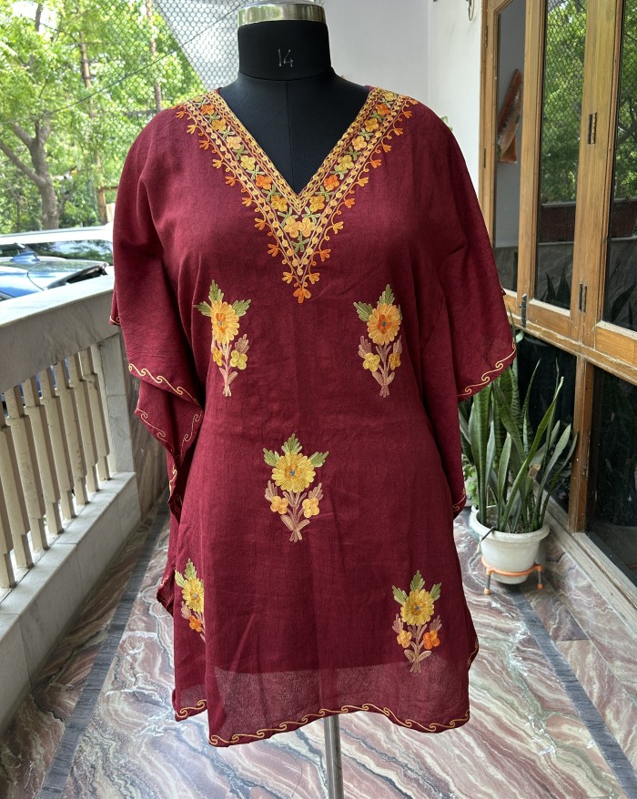 Maroon Kaftan with yellow & green Floral Embroidery | Elegant Summer Style