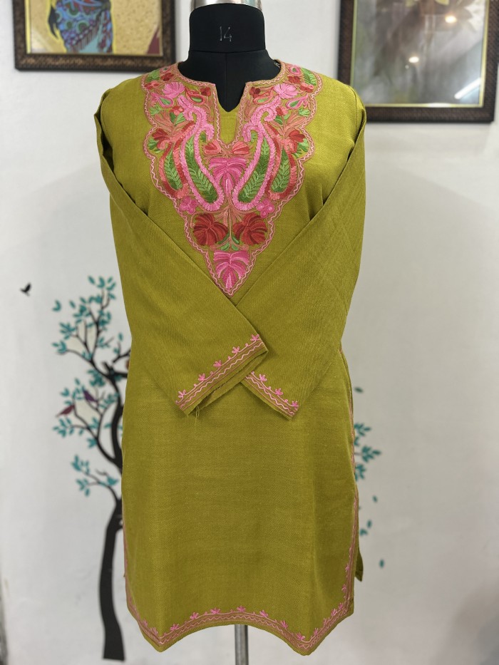 Elevate your everyday winter wardrobe with this beautifully embroidered woolen kurti, combining a comfortable warm fabric with the exquisite traditional artistry of Kashmiri needlework in a vibrant hue.