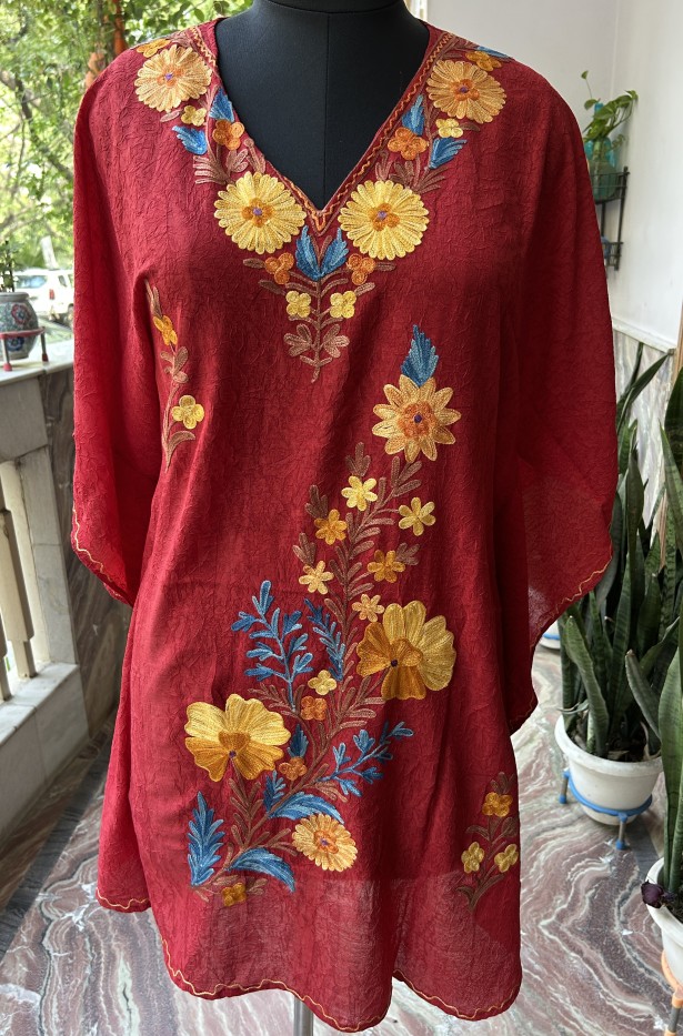 Step into effortless style with our Red Embroidered Cotton Kaftan, crafted to offer both comfort and elegance. Made from premium 180 GSM pure cotton, this biowashed, lint-free fabric ensures breathability and softness all day long. Featuring vibrant floral embroidery on the front and neckline, this half-sleeve kaftan is ideal for casual outings, lounging, or beachwear. The round neck and regular fit suit all body types, making it a must-have in your summer wardrobe. Whether you're dressing up for a relaxed evening or seeking a breezy outfit for a sunny day, this kaftan blends ethnic charm with modern comfort seamlessly.