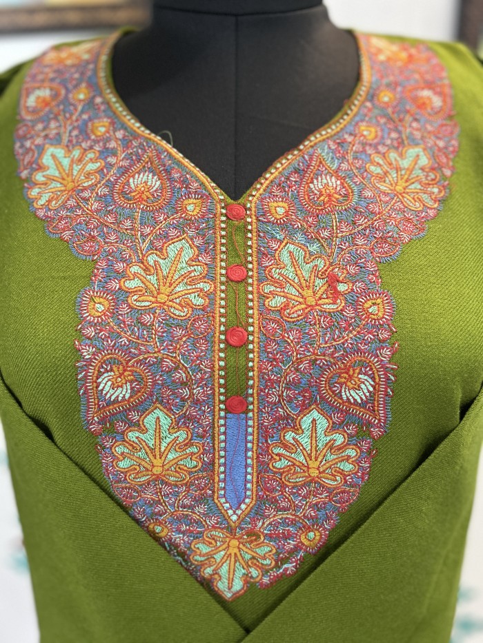 Indulge in the luxury of traditional craftsmanship with this exquisite woolen kurta. The classic silhouette is transformed by the elaborate Aari embroidery that covers the neckline, making it a true statement piece for the colder months.