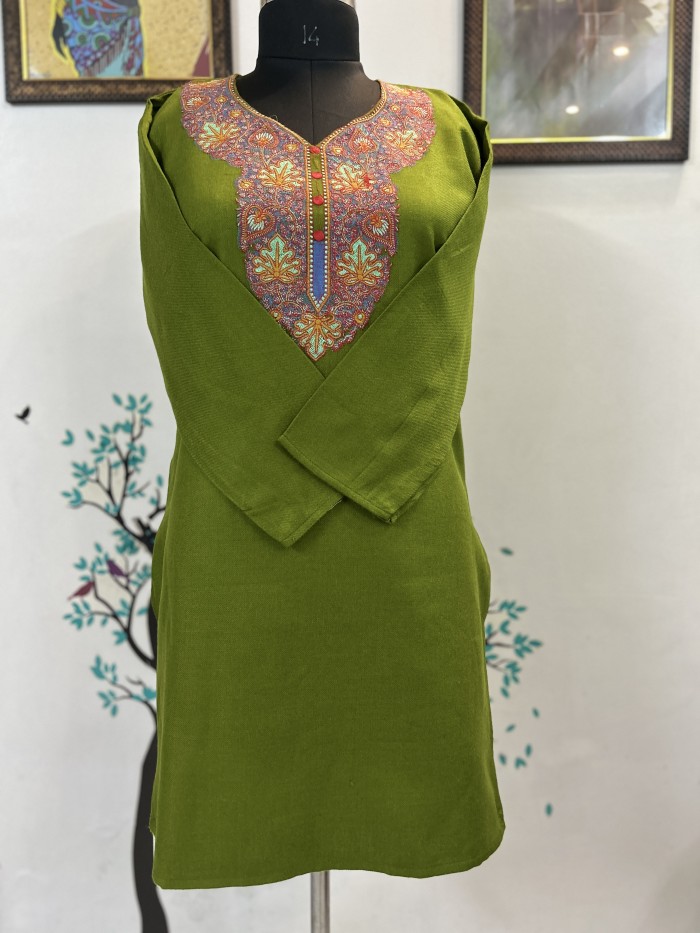 | Craftsmanship & Comfort : | 1. Genuine Aari Work: Intricate and vibrant thread embroidery (Aari work) adorns the neckline, showcasing rich Indian textile tradition. 2. Soft Wool Blend: Crafted from a comfortable, warm wool/pashmina blend fabric, perfect for winter and cold weather. 3. Classic Straight Fit: Features a straight cut with side slits for a flattering fit and ease of movement. 4. Versatile Style: Can be paired with leggings, pajamas, or jeans for an elegant casual or semi-formal look. |