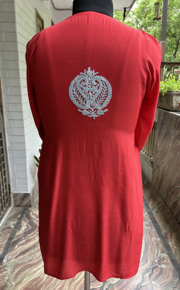 Elevate your style with our "Crimson Paisley" Kashmiri Aari Embroidered Kurti, a striking piece that beautifully blends vibrant color with intricate artistry. The rich red fabric serves as a stunning backdrop for the elegant white, hand-stitched Aari embroidery that adorns the neckline and extends to the cuffs and body. The classic paisley motifs, a symbol of heritage and design, are meticulously crafted on the sleeves and throughout the kurti.