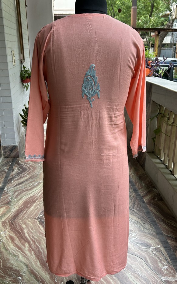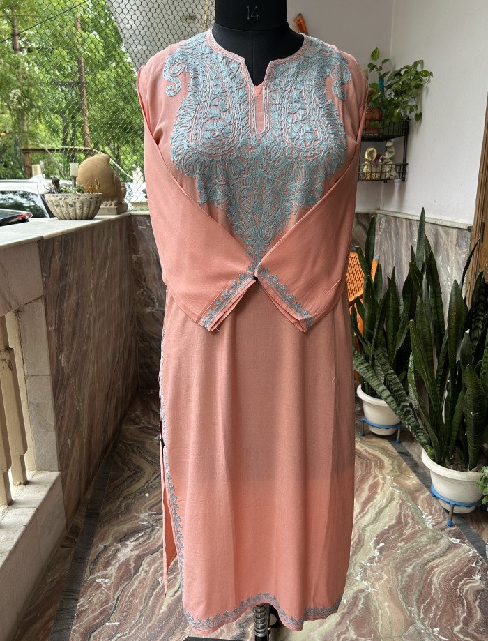 Our "Pastel Bloom" Kashmiri Aari Embroidered Kurti is a true celebration of delicate craftsmanship and modern design. The beautiful peach color of the fabric provides a subtle canvas for the exquisite light blue Aari embroidery that adorns the neckline and extends down the front. The intricate floral patterns are meticulously hand-stitched, making this kurti a unique work of art.