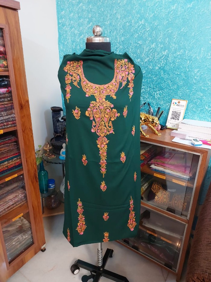 Make a statement with our Unstitched Handwork Kashmiri Aari Suit in a magnificent forest green. This exquisite suit material is a testament to the vibrant artistry of Kashmir, featuring vivid Aari embroidery in a stunning combination of pink and orange threads. The intricate floral and paisley patterns are meticulously hand-stitched across the front, creating a dense and captivating design that truly stands out. Crafted from a comfortable and refined fabric, this unstitched suit provides the perfect canvas for your personalized style. Its adaptable nature allows you to tailor it to your exact measurements and preferred design, ensuring a perfect and flattering fit. Elevate your wardrobe with this striking piece that combines comfort, customization, and the unparalleled beauty of Kashmiri hand embroidery, making it a luxurious addition to any collection.