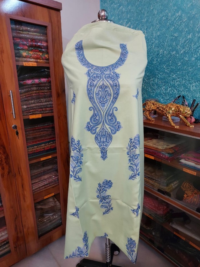 Infuse your wardrobe with a breath of fresh air with our Unstitched Handwork Kashmiri Aari Suit in a delightful pista green. This exquisite suit material showcases the vibrant artistry of Kashmir, featuring bold blue Aari embroidery. The prominent traditional motifs are meticulously hand-stitched across the front, creating a captivating and unique design that stands out with its artistic flair. Crafted from a comfortable and substantial fabric, this unstitched suit provides the perfect canvas for your personal style. Its adaptable nature allows you to tailor it to your exact measurements and preferred design, ensuring a perfect and flattering fit. Elevate your wardrobe with this unique piece that combines comfort, customization, and the unparalleled beauty of Kashmiri hand embroidery, making it a cherished addition to any collection.