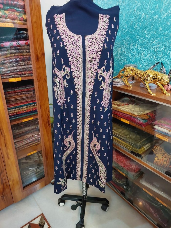 Step into a realm of exquisite beauty with our Unstitched Kashmiri Aari Work Suit in a captivating midnight blue. This magnificent suit material is a true masterpiece of Kashmiri craftsmanship, featuring elaborate and dense Aari embroidery in beautiful shades of pink and gold. The intricate traditional motifs, meticulously hand-stitched across the entire front panel, create a stunning visual tapestry that exudes opulence and cultural richness. Crafted from a refined fabric, this unstitched suit offers a substantial feel while providing the perfect canvas for your personalized style. Its adaptable nature empowers you to tailor it to your precise measurements and design preferences, whether you envision a grand suit set for a wedding, a sophisticated ensemble for a festive event, or a timeless addition to your formal wardrobe. Elevate your collection with this unique piece that blends customizable comfort with the unparalleled grandeur of Kashmiri hand embroidery.